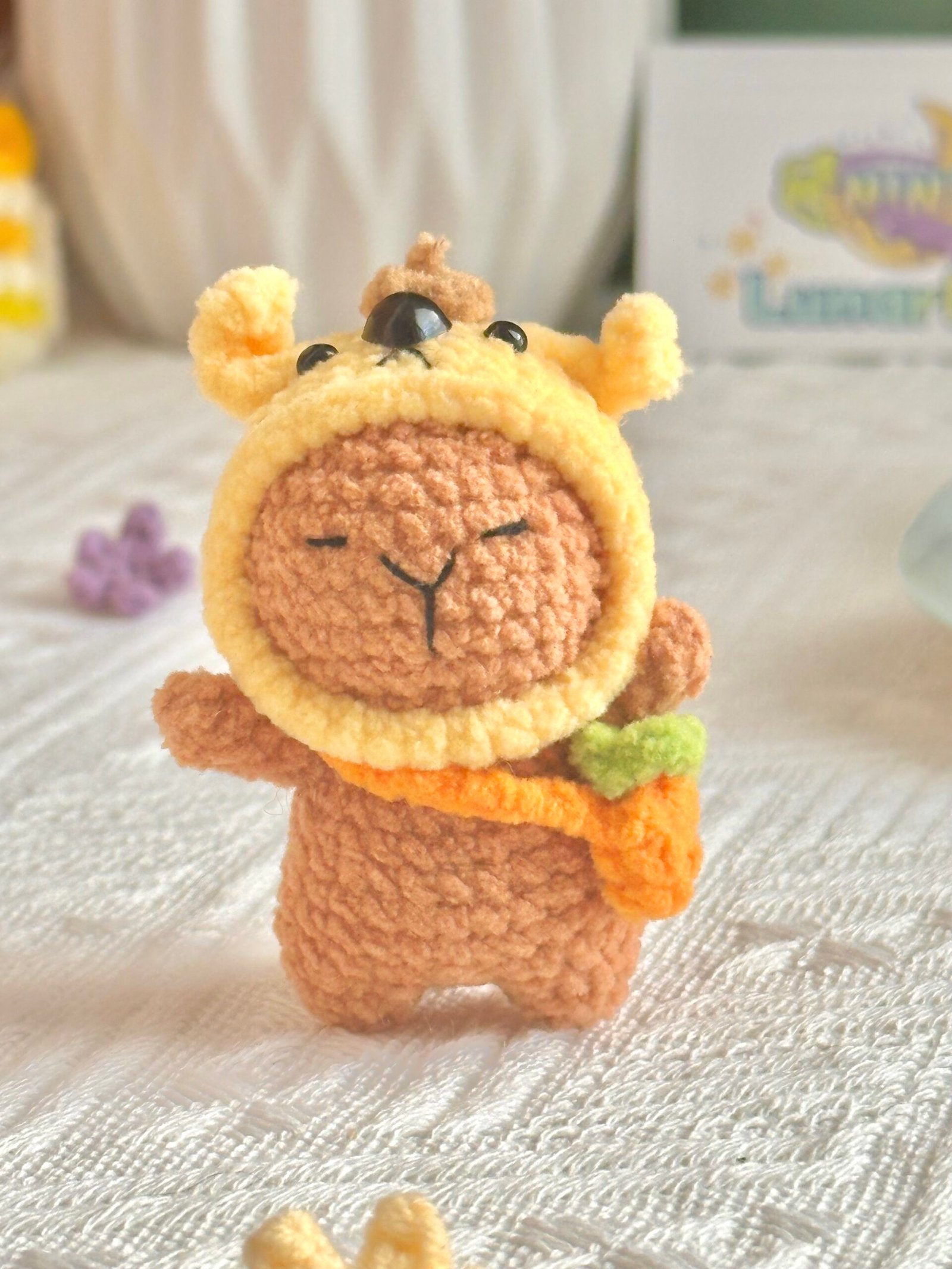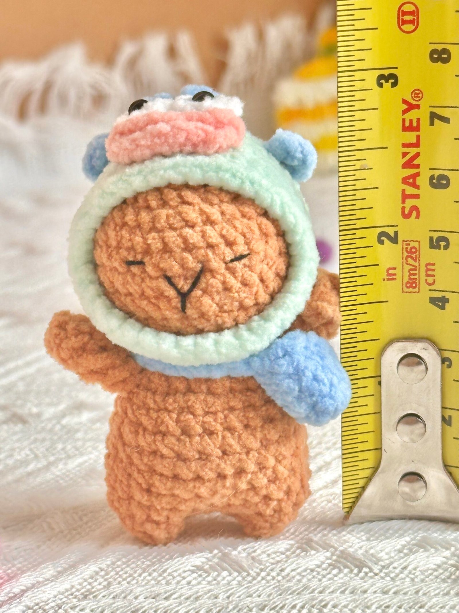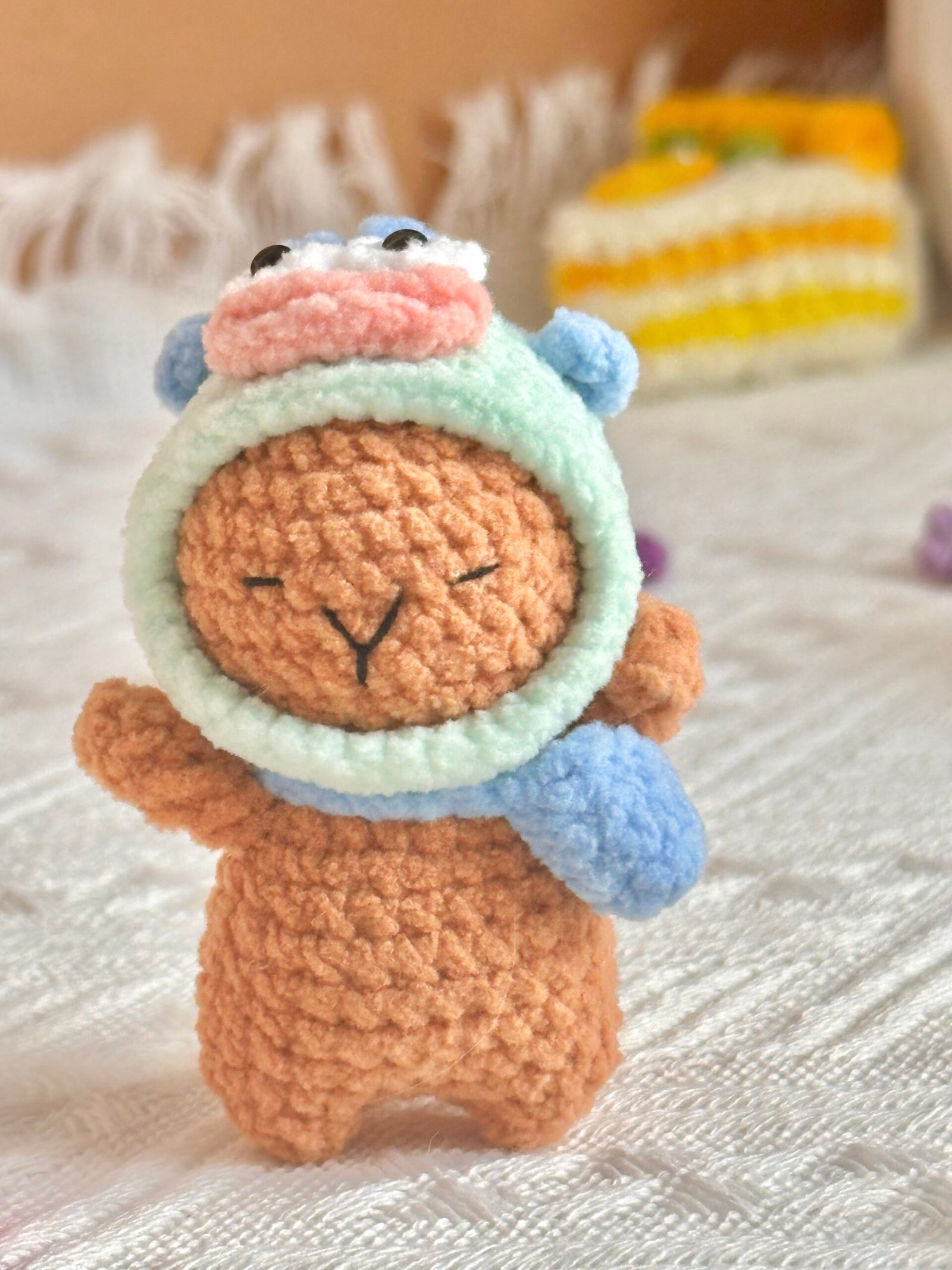 Say hello to this charming capybara with a twist — this adorable handmade doll carries a tiny turtle on its back! Lovingly crocheted with soft yarn and stuffed with cotton, this unique design brings double the cuteness in one cuddly piece. It’s the perfect gift for animal lovers or a delightful addition to any crochet collection.