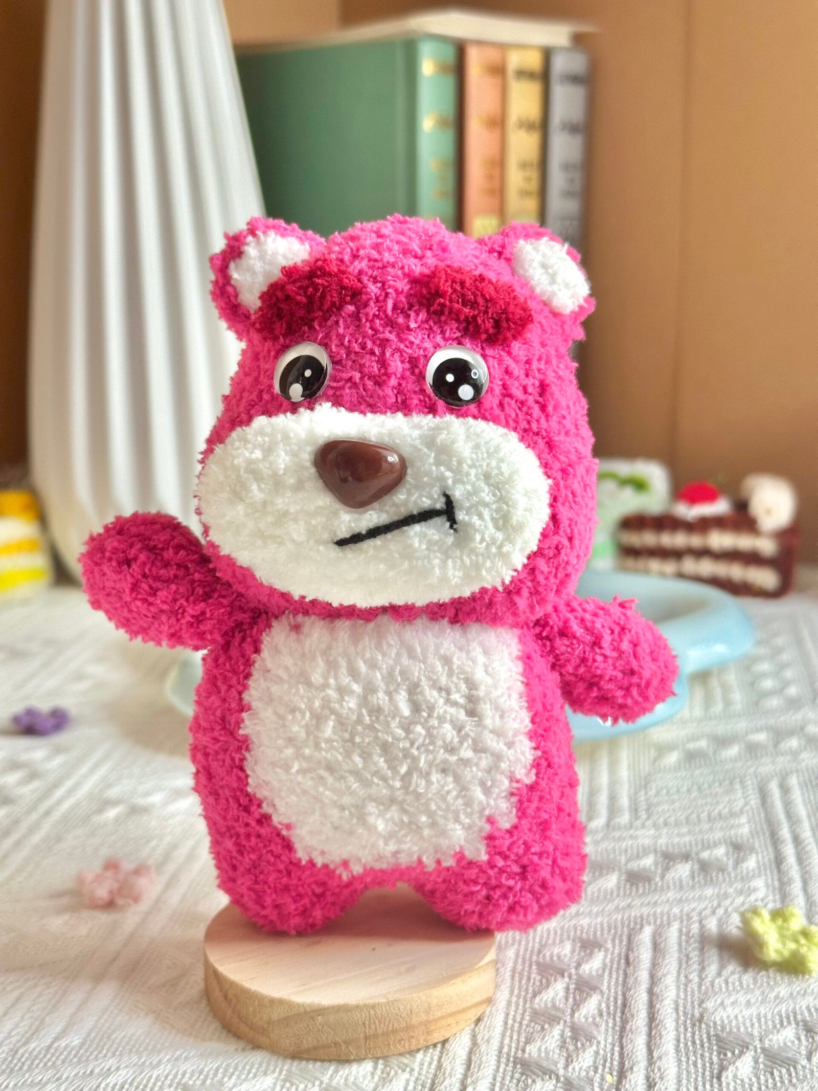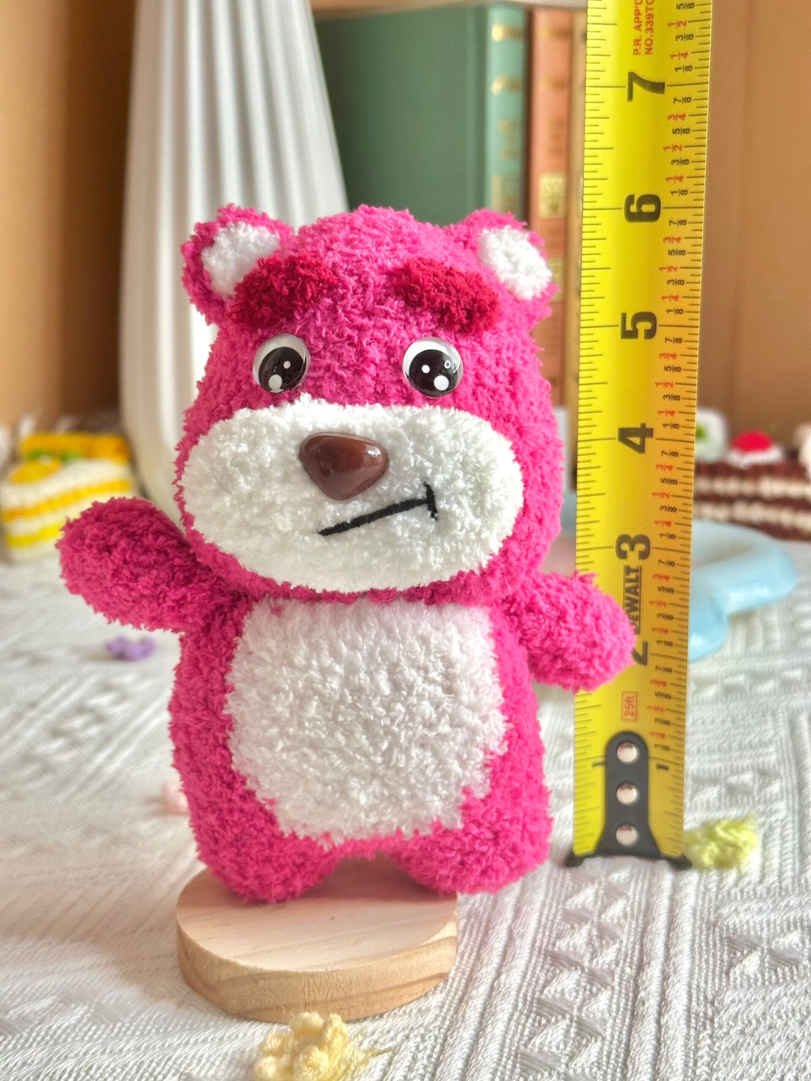 Meet Lotso, the plush, crocheted version of everyone’s favorite pink bear with a big heart (and a little mischief). Made with soft, durable yarn and carefully stuffed, Lotso brings his signature grumpy yet endearing personality to life in handmade form. Whether as a gift or a collector’s item, this Lotso doll is ready to add charm to your collection.