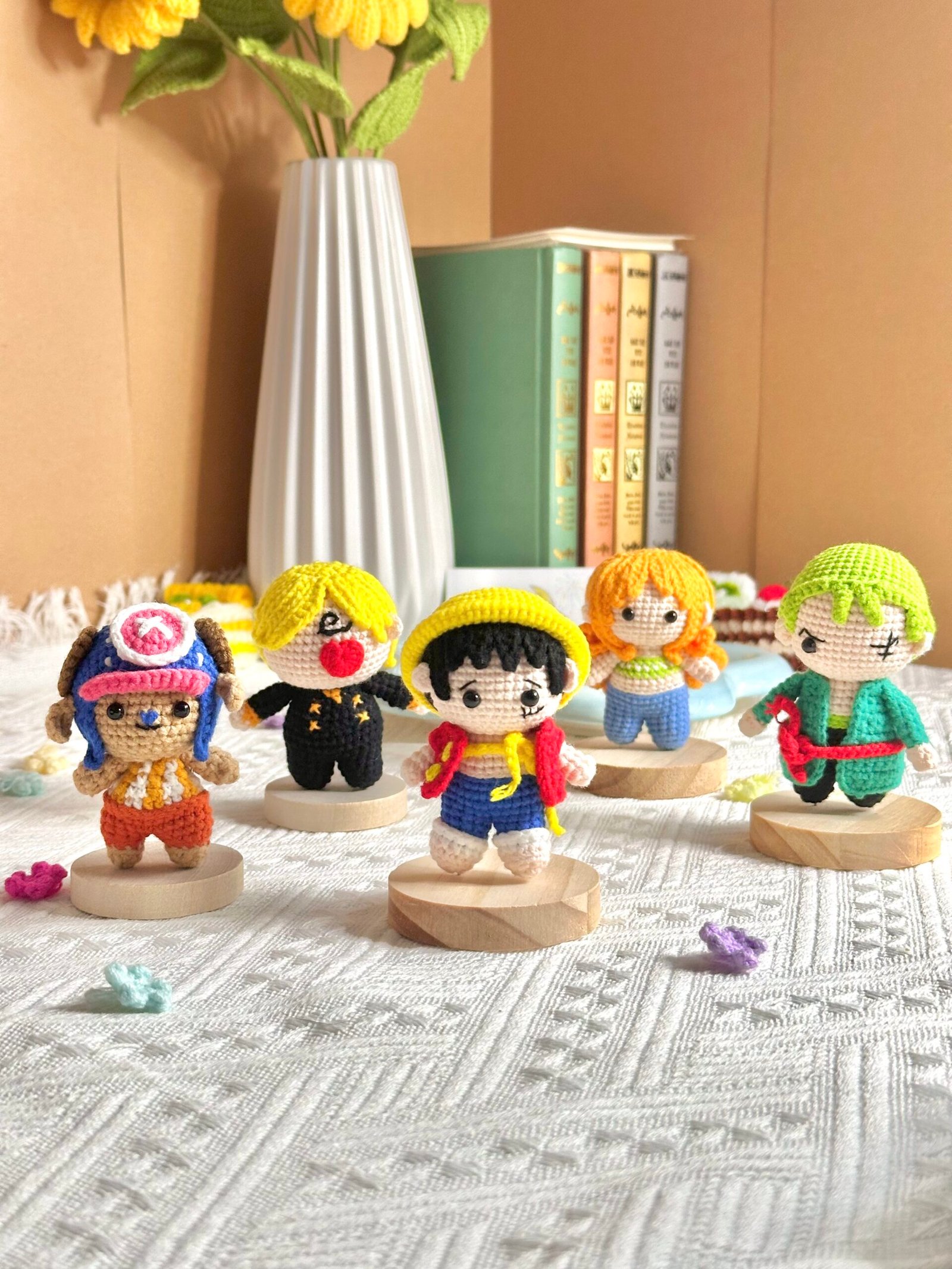 Bring the Grand Line to your shelf with this handcrafted One Piece crochet doll set! This collection includes five fan-favorite characters — each lovingly made by hand using soft yarn and quality cotton stuffing. From Nami’s stylish look to Zoro’s iconic swords and Chopper’s signature hat, every detail is carefully crafted to reflect the spirit of the Straw Hat crew.