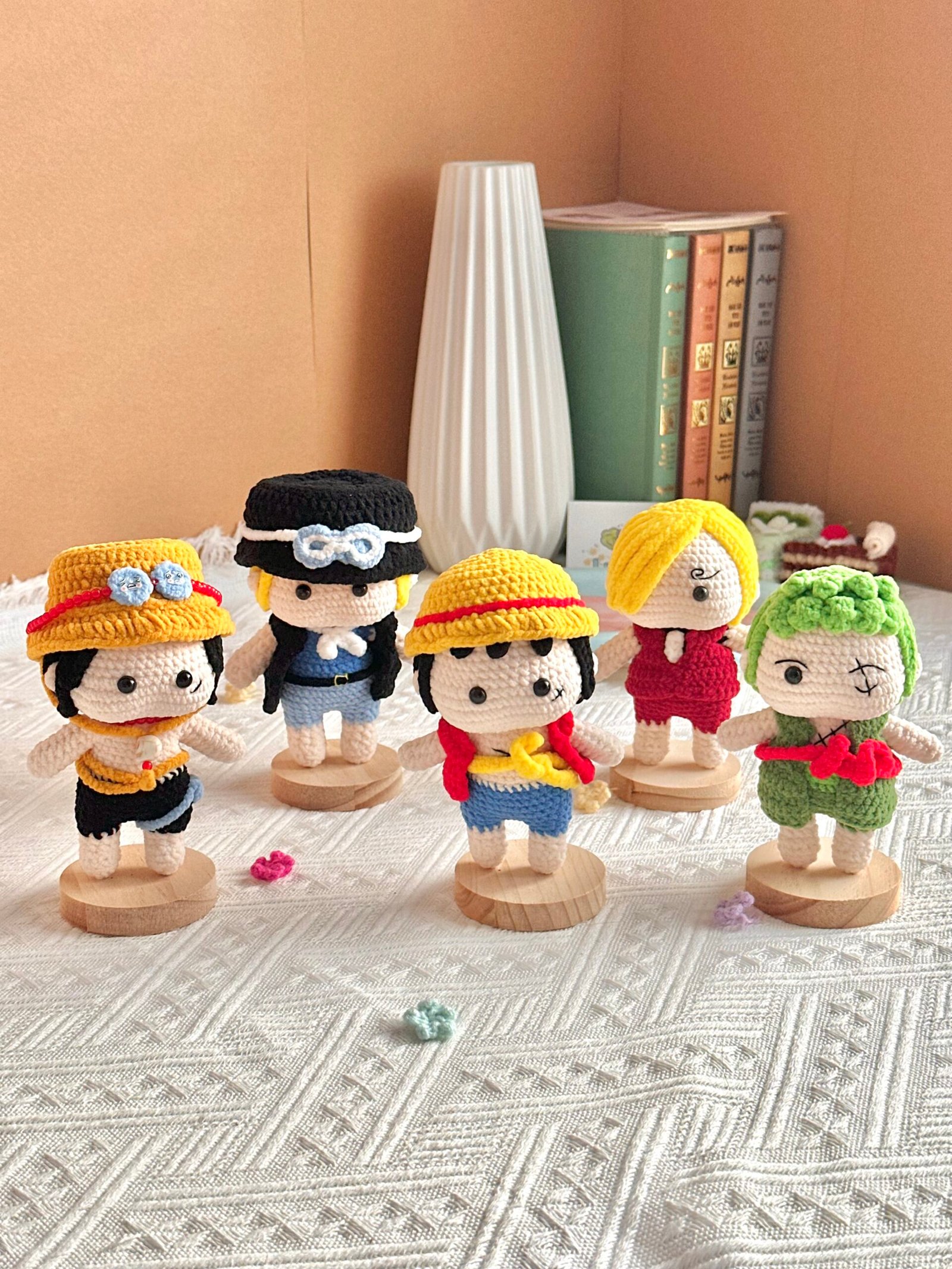 Set sail with this exclusive 5-piece One Piece crochet doll set, showcasing your favorite Straw Hat heroes and their legendary allies. Each doll is fully handmade with care — from the iconic straw hat and fiery fists to detailed costumes that capture the spirit of each character.