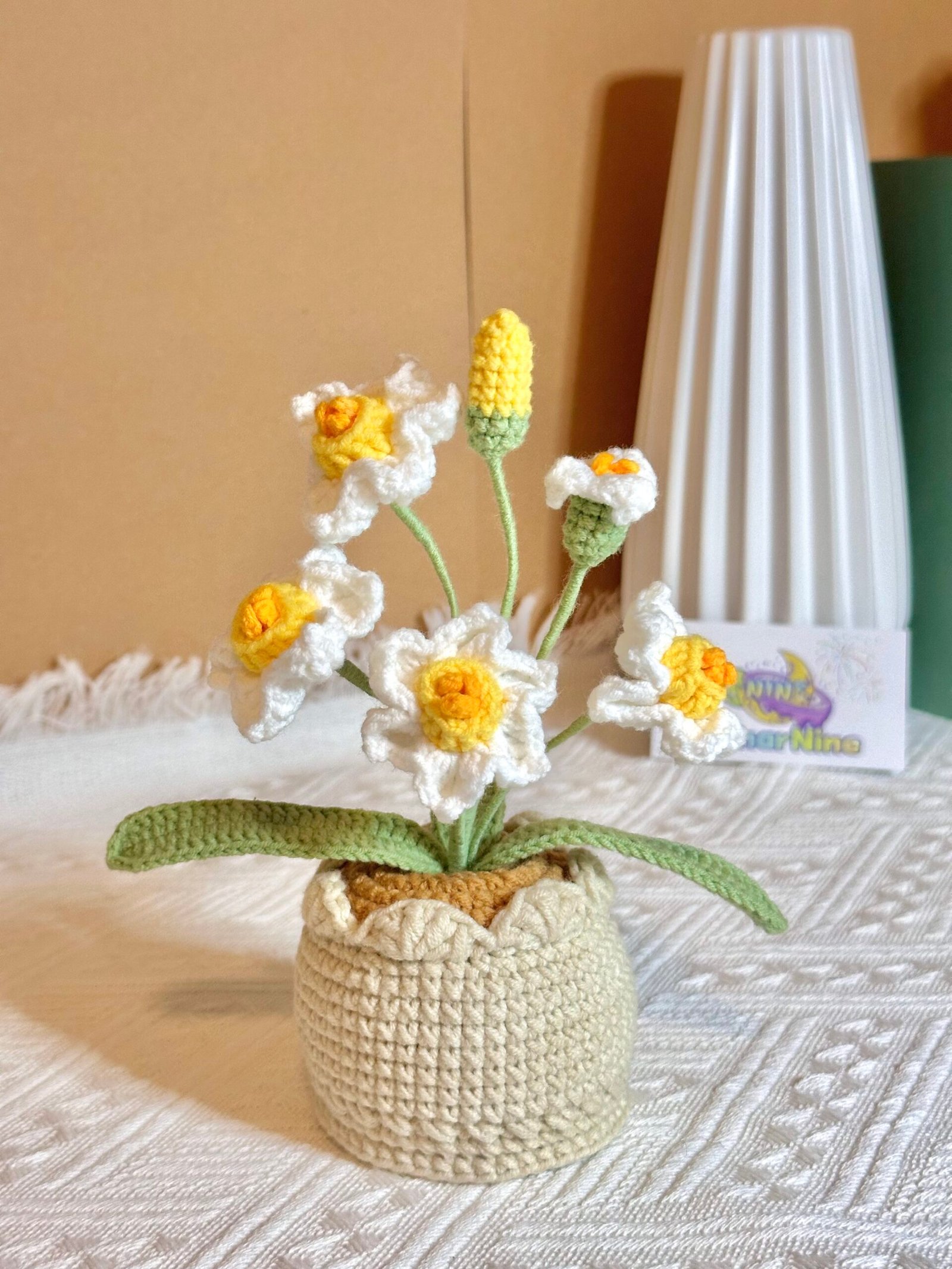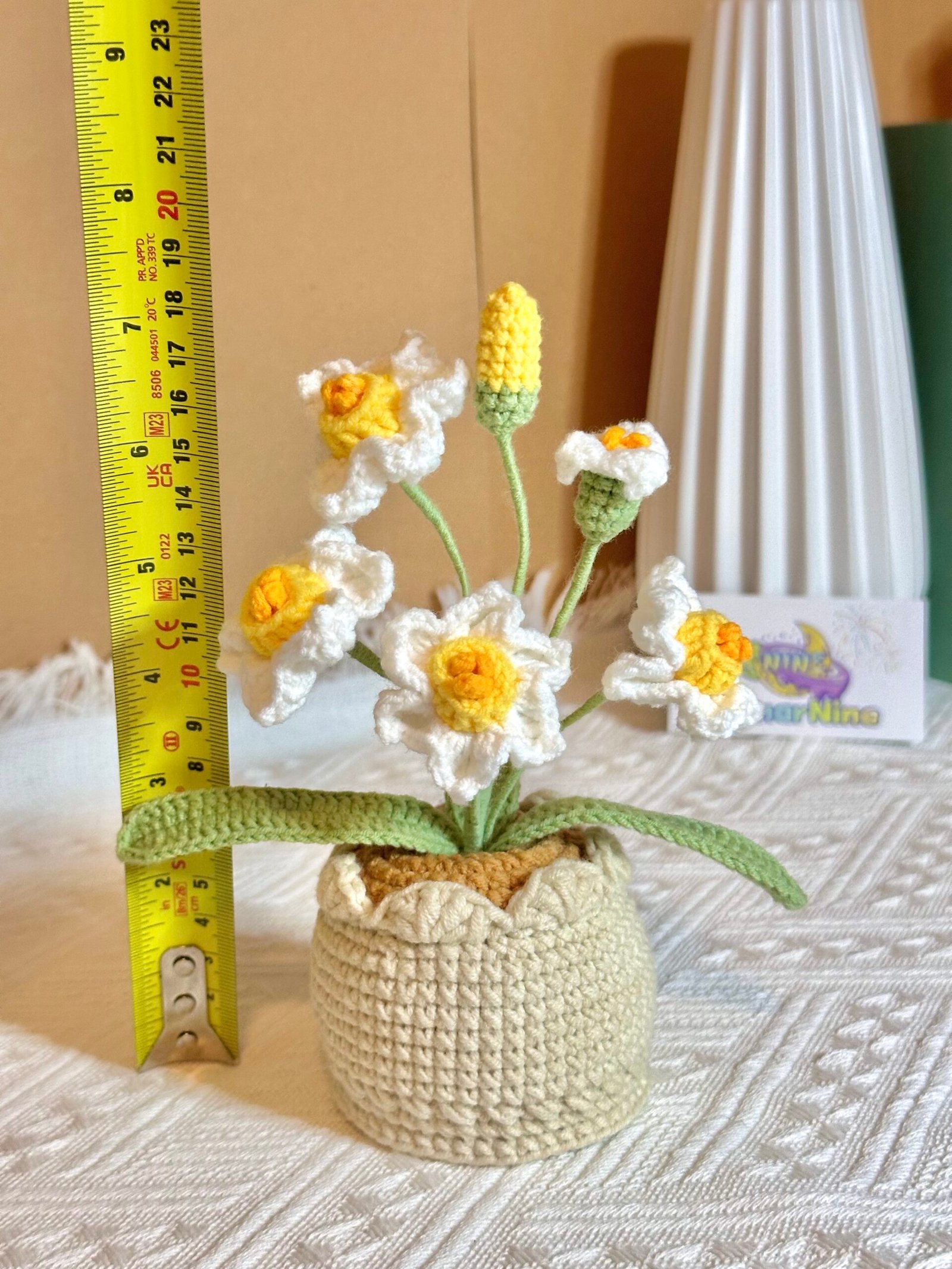 Bring sunshine indoors with this handcrafted crochet daffodil arrangement in a medium-sized pot. With its signature trumpet shape and joyful yellow tones, this flower adds warmth and charm to any space — no watering needed!