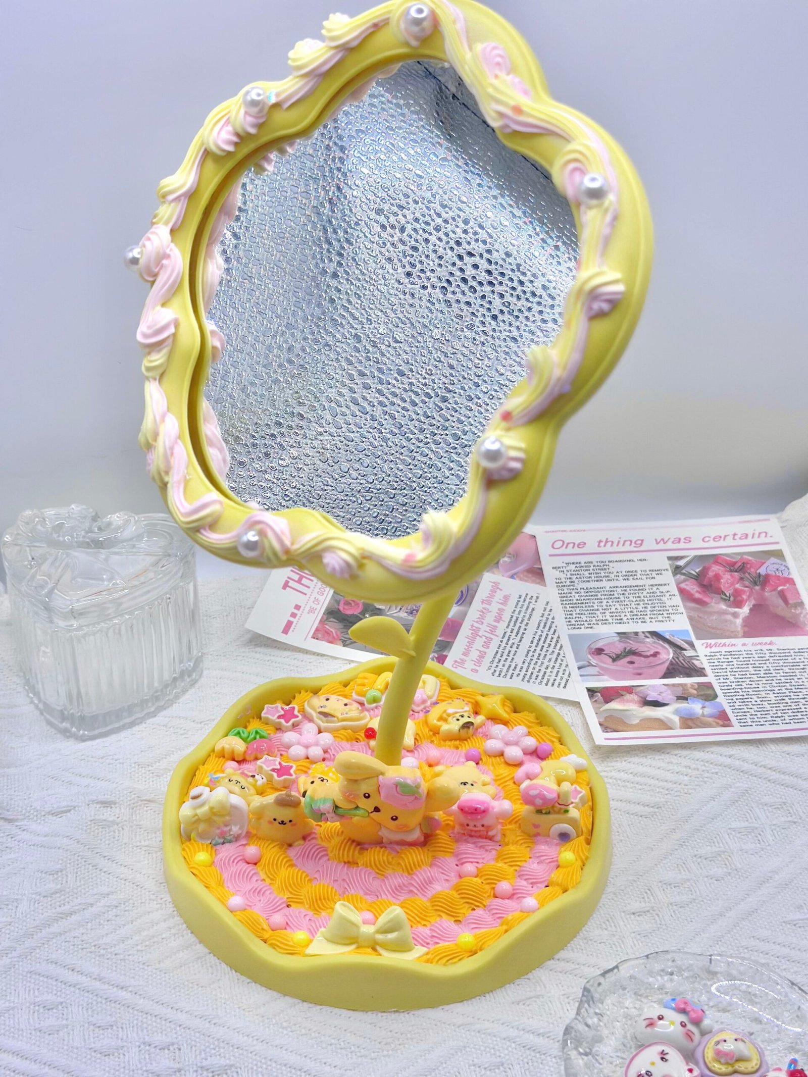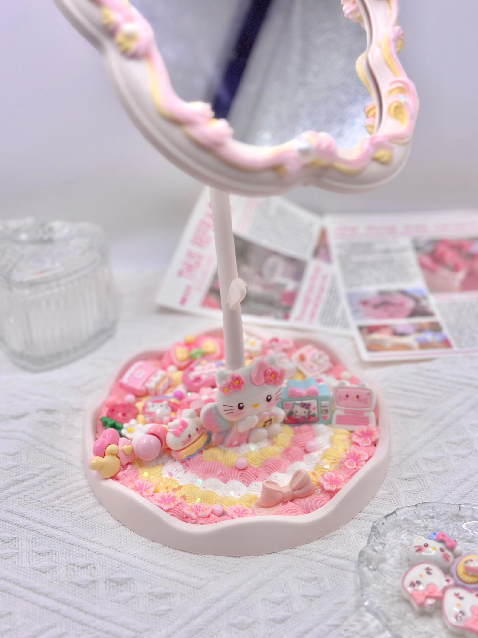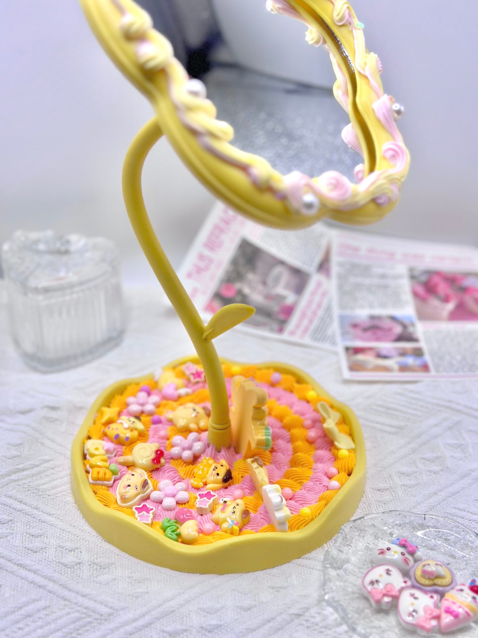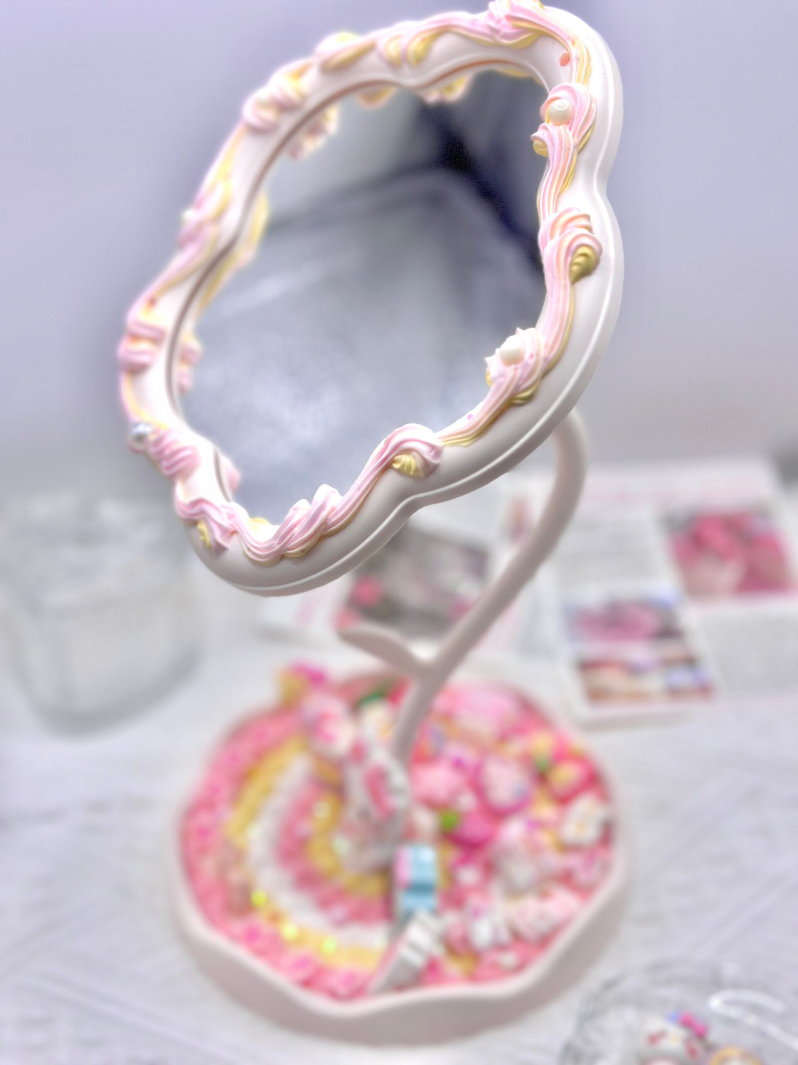This Decoden Flower Makeup Mirror is a charming addition to your vanity or bag. Shaped like a blooming flower and hand-decorated with whipped cream glue, sparkly charms, and pastel details, it’s perfect for quick touch-ups or full glam sessions with a cute twist.