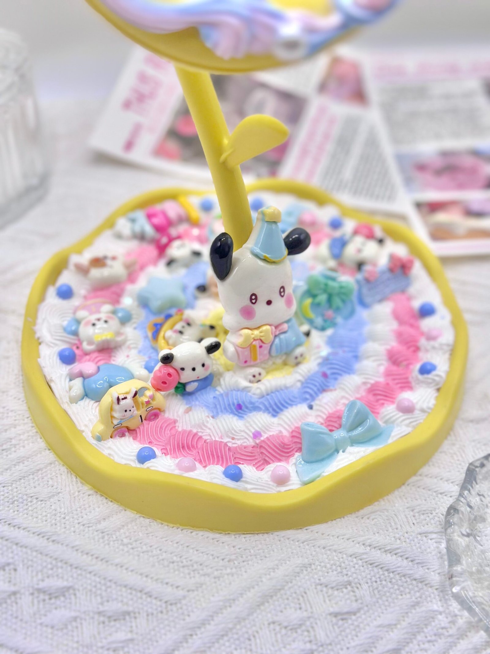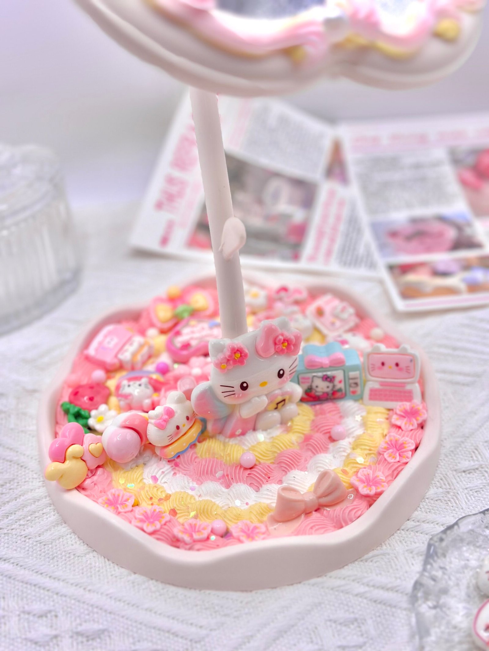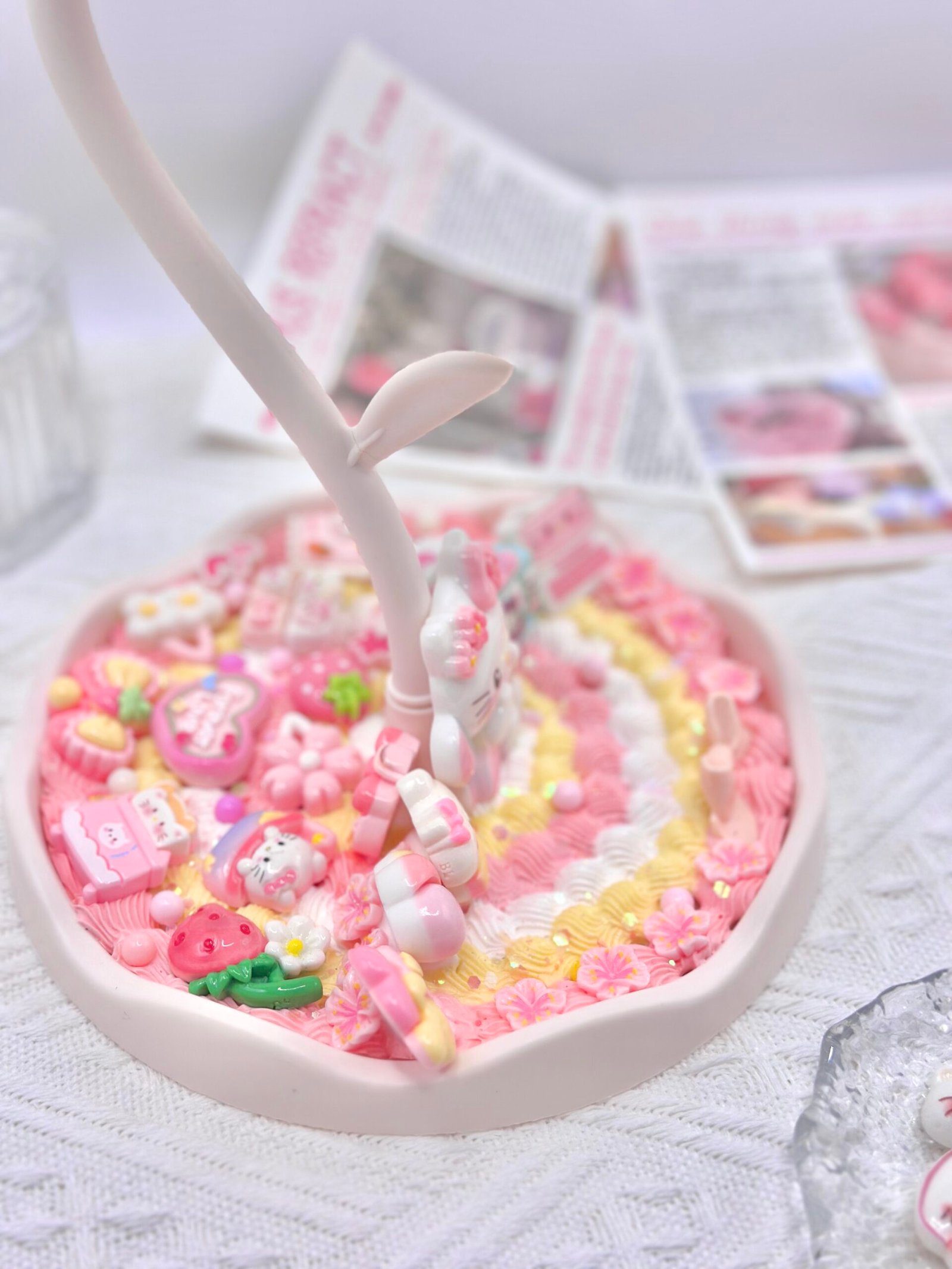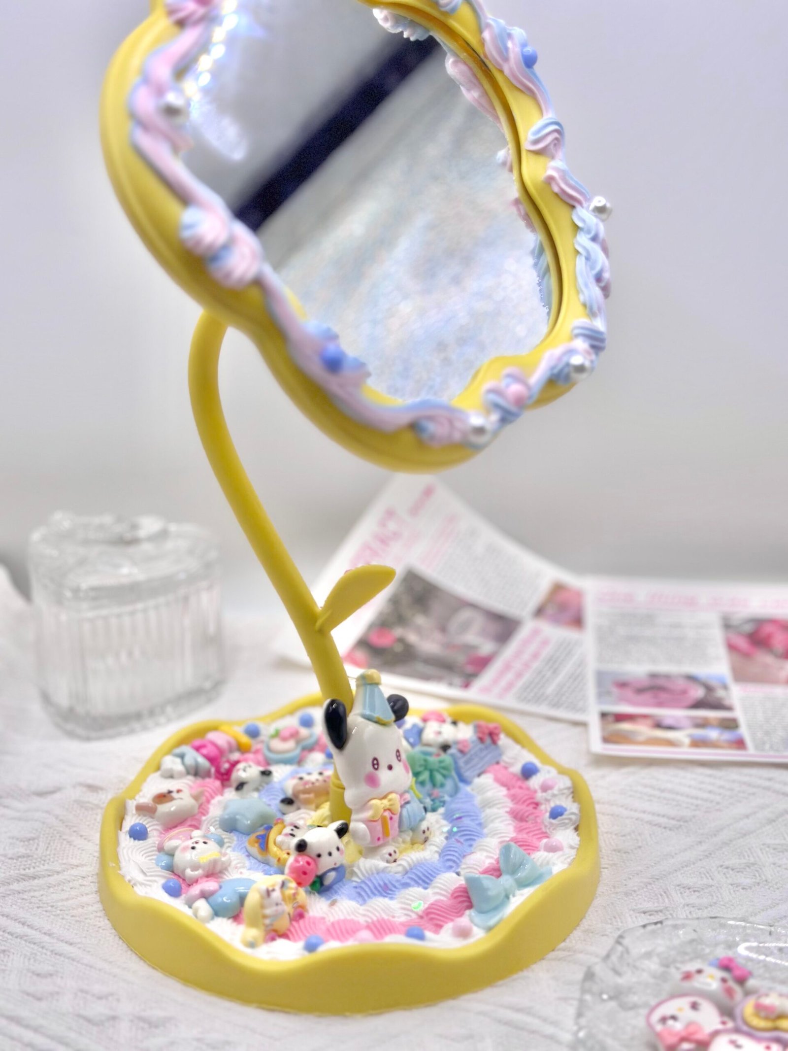 This Decoden Flower Makeup Mirror is a charming addition to your vanity or bag. Shaped like a blooming flower and hand-decorated with whipped cream glue, sparkly charms, and pastel details, it’s perfect for quick touch-ups or full glam sessions with a cute twist.