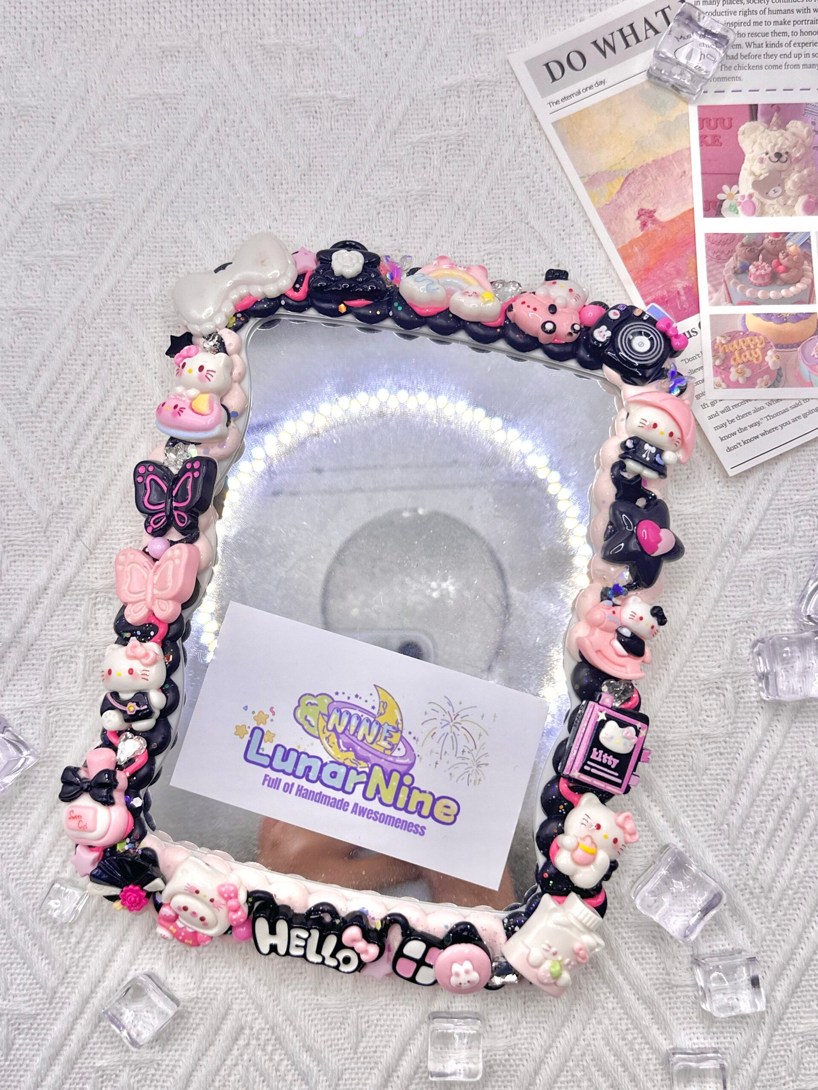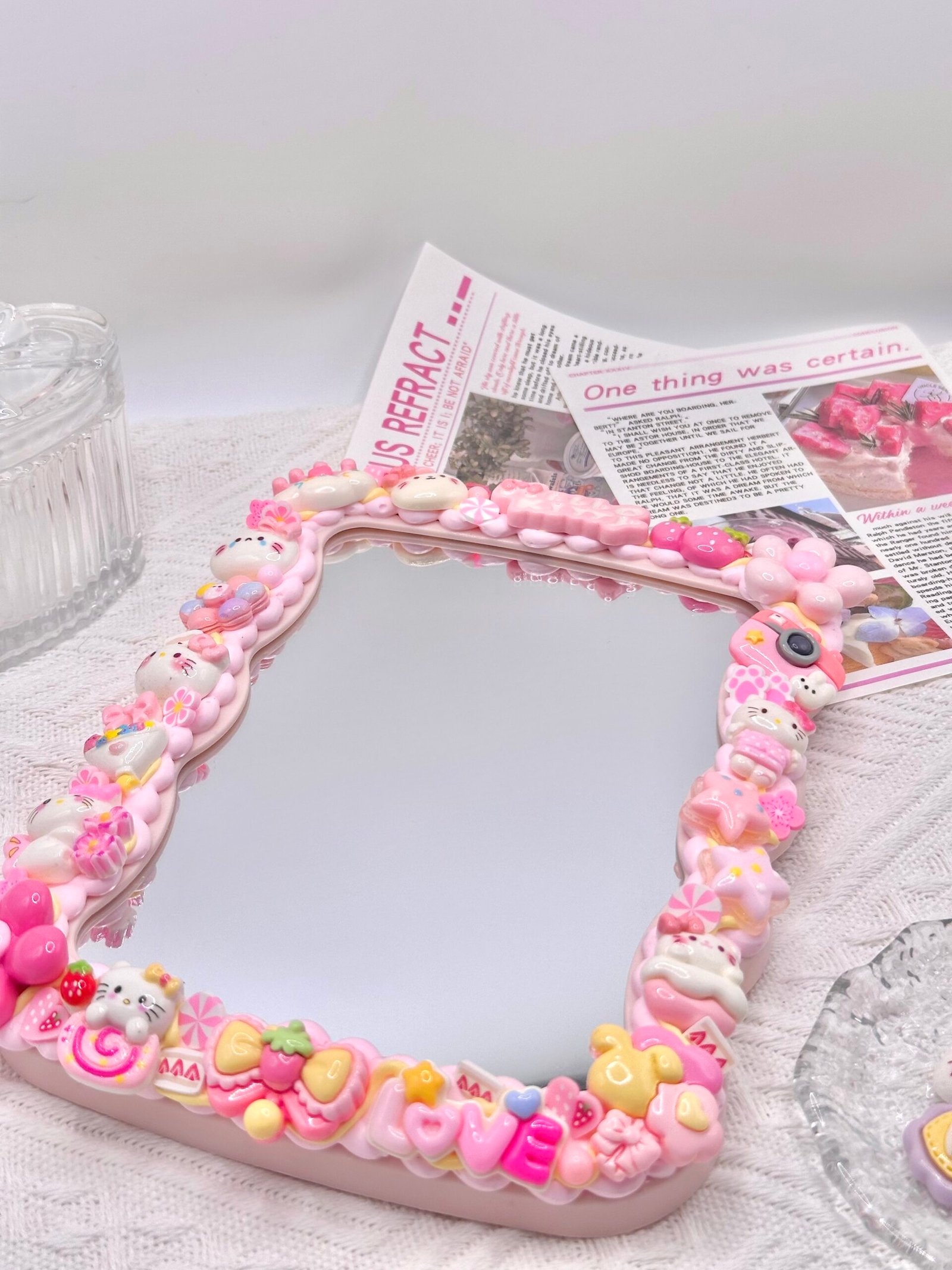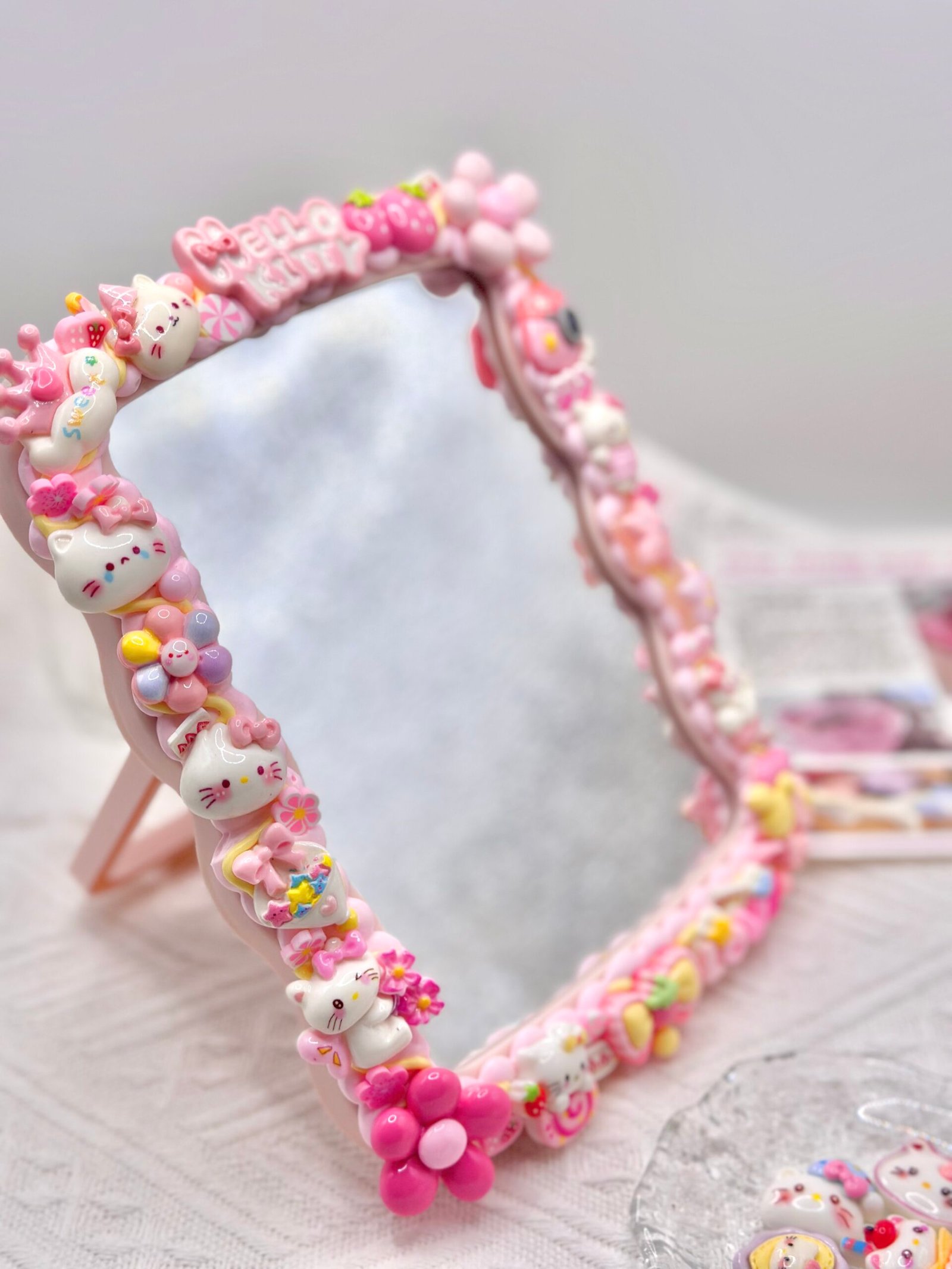 Each piece is lovingly hand-decorated with fluffy cream glue, glittering rhinestones, and dreamy pastel charms — turning an everyday mirror into a work of art. Compact yet eye-catching, it’s perfect for makeup touch-ups, selfies, or simply admiring your sparkle on the go!