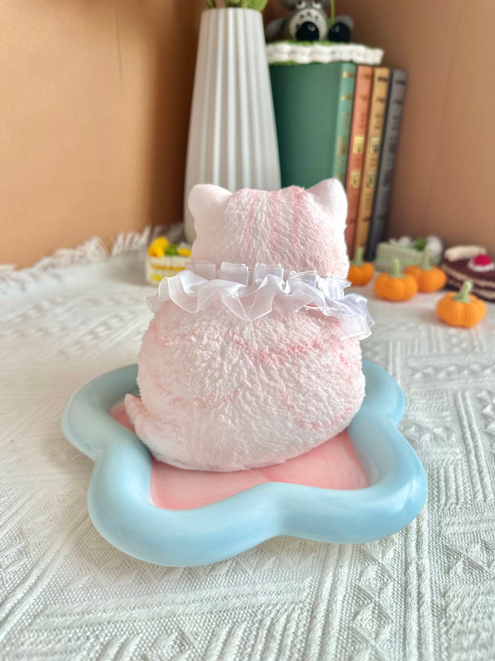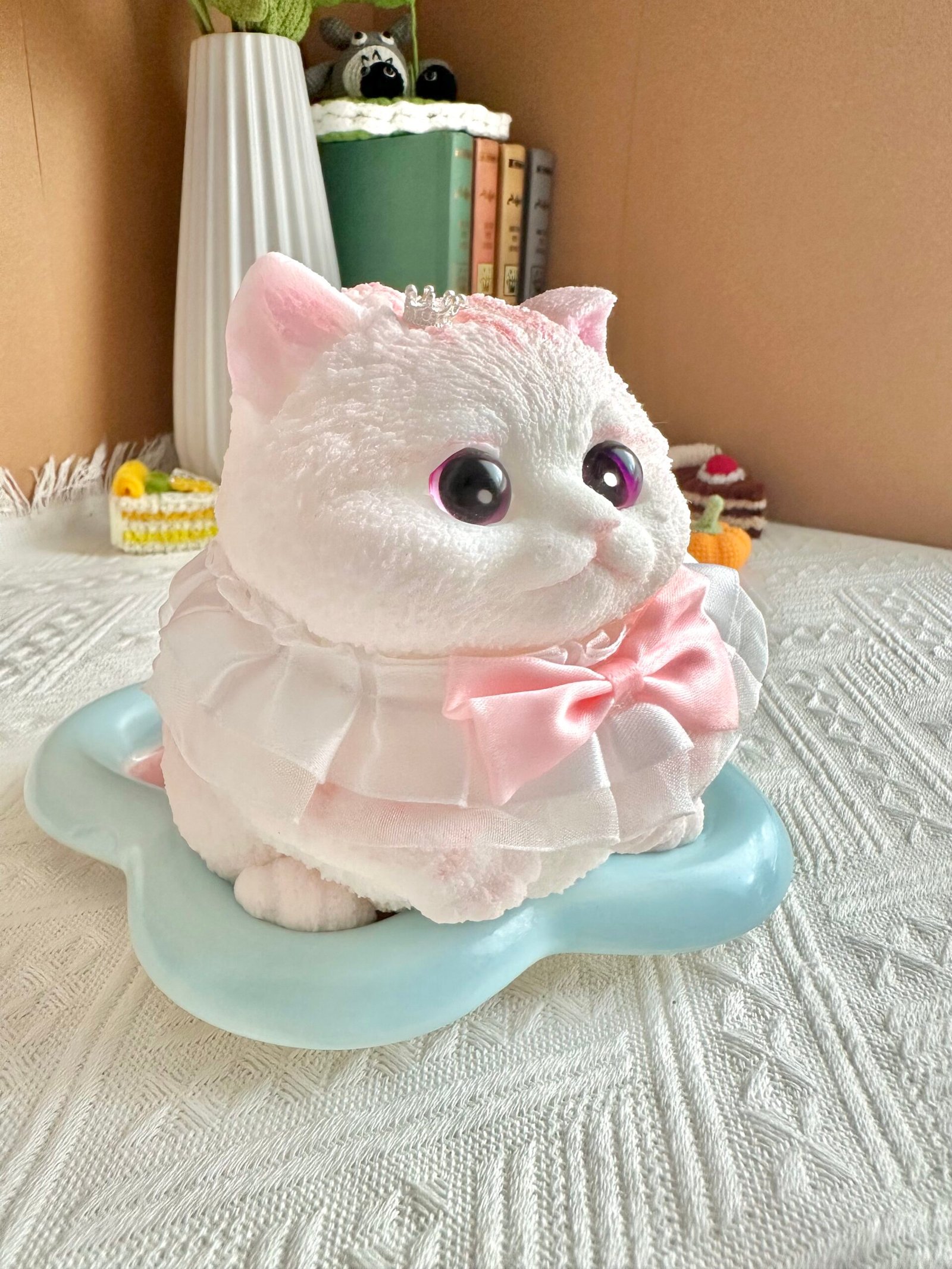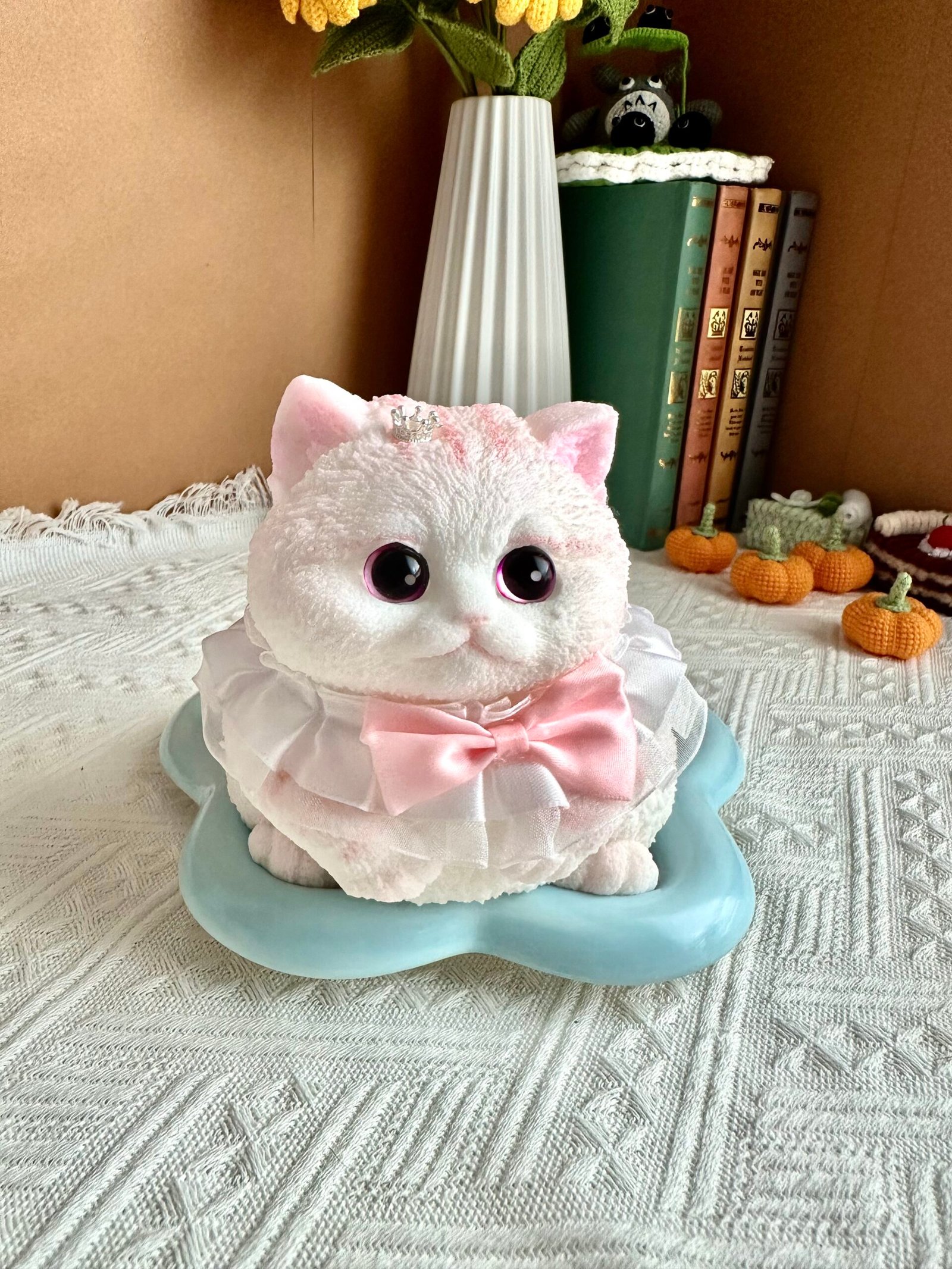 Handmade and hand-painted with sweet cat features
